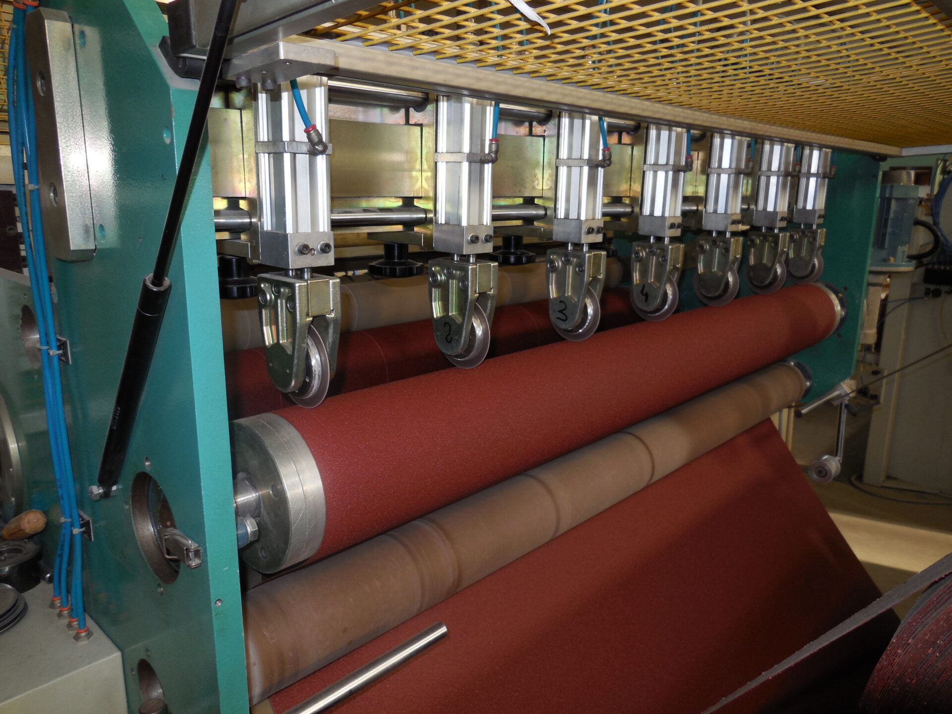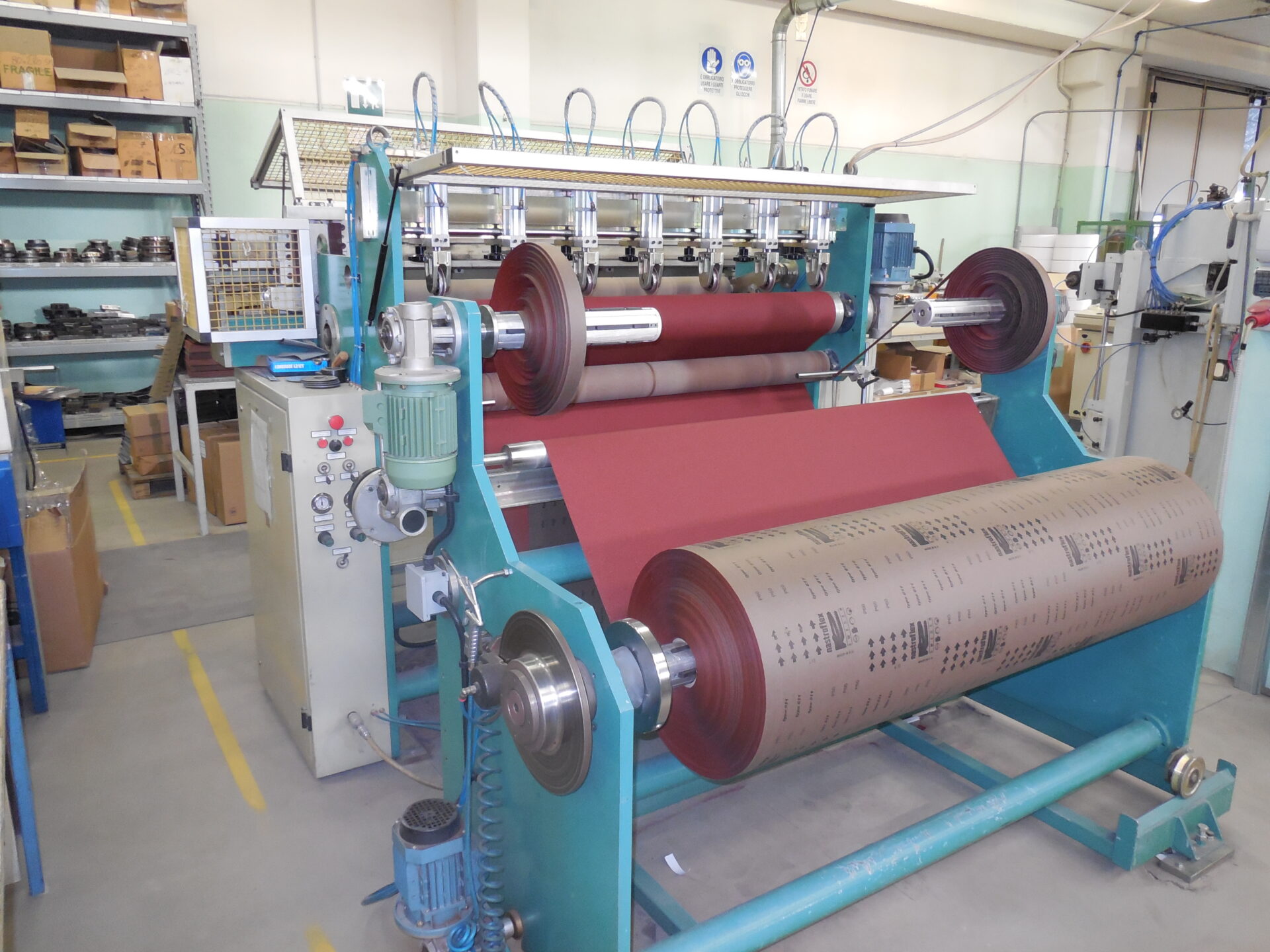 This is an automatic equipment for the cutting of abrasive cloth and paper rolls. This fully automatic machine cuts and neatly stacks the sheets; it consists of a transverse cutting unit that operates with a cup blade. The cutting frequency is very high; it is possible to work with all types of abrasive cloths and papers. This system is supervised by a PLC and an axis control system that has been developed to control the handling kinematics of the servomo-tors that perform the cutting of the material. This piece of equipment can be adapted to work on Master Jumbo rolls, up to 1000kg weight.