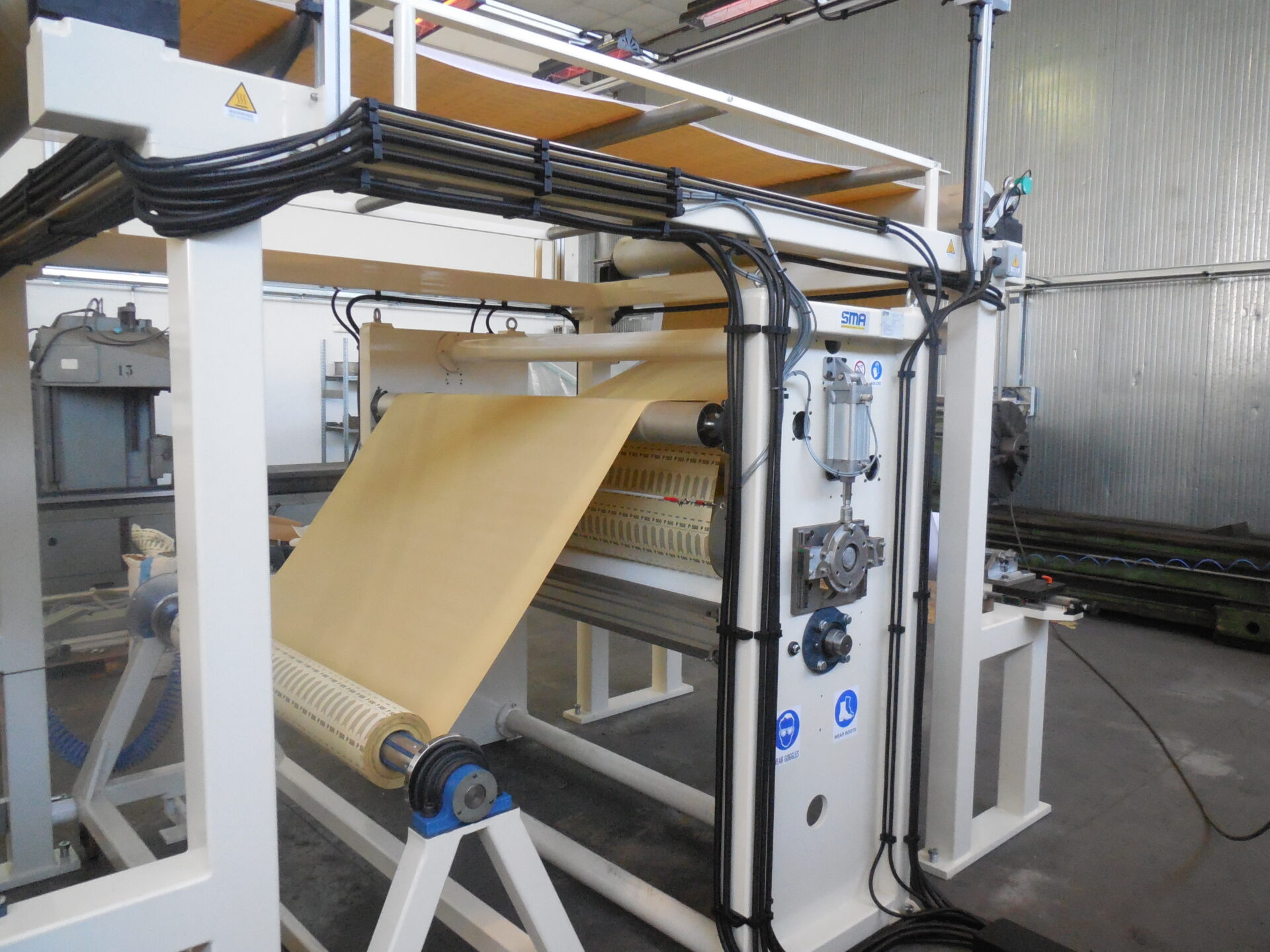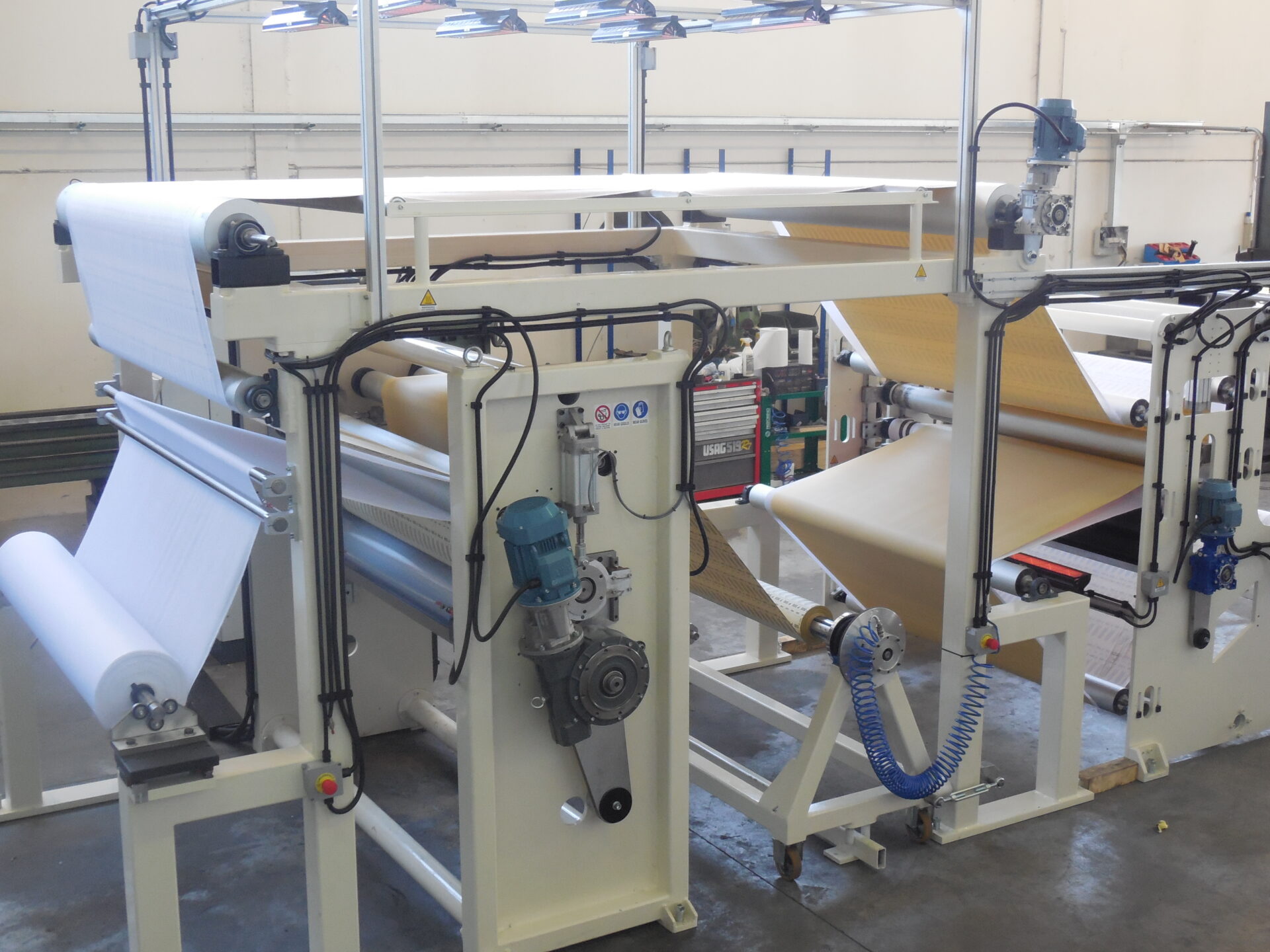Medium-capacity automatic equipment fo the lamination of abrasive cloth and paper with Velcro or foam. As option, the machine can host a roller printing unit at the end of the line. unwinding and rewinding units are composed of 3” (76mm) shafts, and the whole system is equipped with aligning devices for every stage, from glue spreading to lamination, drying and rewinding.