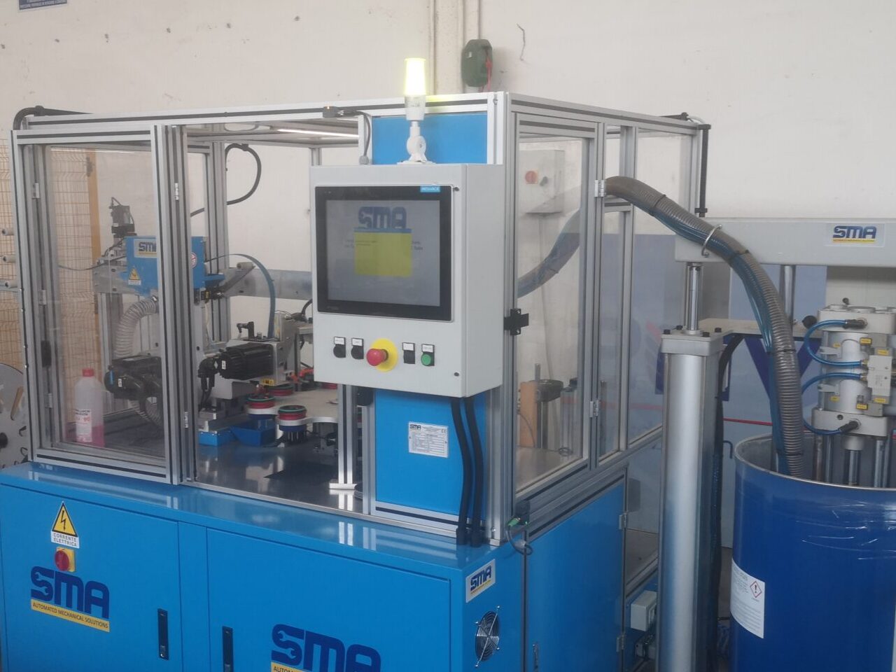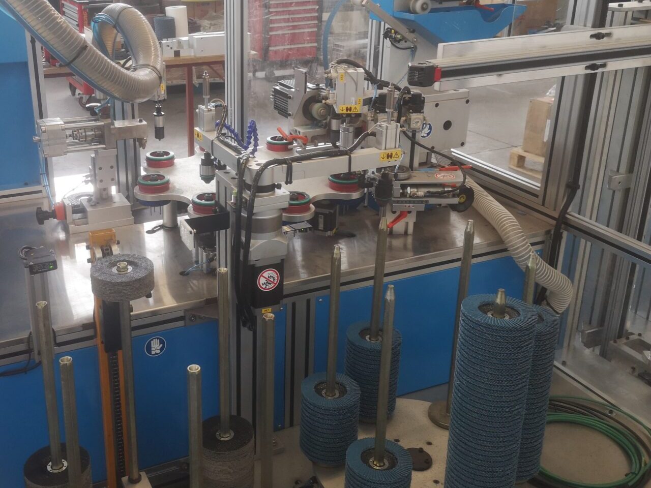 SMA-TFDZ is the new-generation automatic machine for flap disc production, an evolution SMA-TFDM / SMA-TFDF projects. Simple and intuitive, this unit features a 360° network connection, maintenance is easily manageable by non-skilled operators. The main body is made of heavy steel with metal covers on the sides. The brand-new cutting head can handle a working speed superior to 30Hz. 15’ HMI operator panel, with Ethernet communication. A special Ethercat field bus by Inovance allows drives’ communication at an extremely high speed.