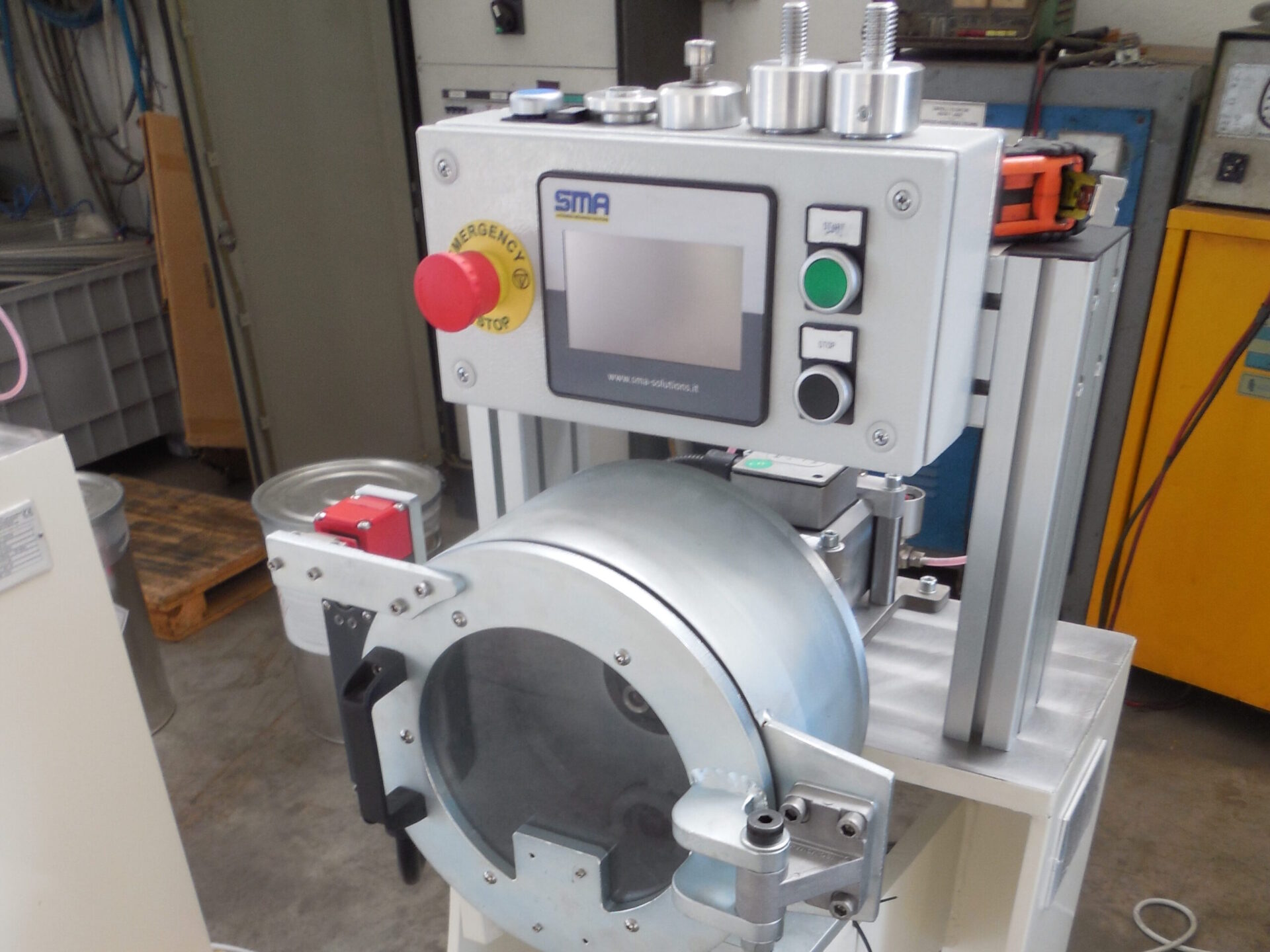 This machine for the speed test of mini flap disc and mini flap wheels; maximum rotational speed is 65,000 RPM. Programming is handled via insertion of one or multiple batch production numbers of all the raw materials used for the production of such tools. Upon completion of the test, the machine will automatically create a .txt file that can be exported to a USB memory stick.