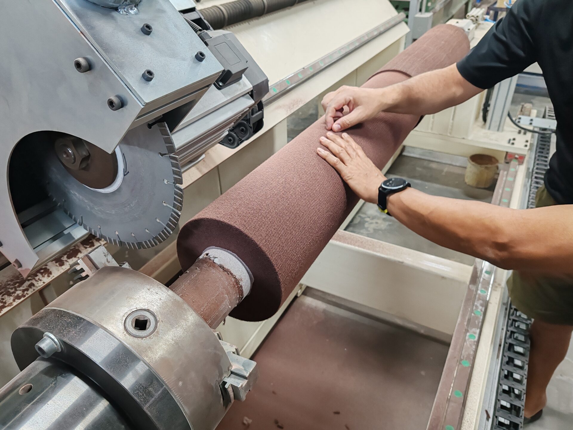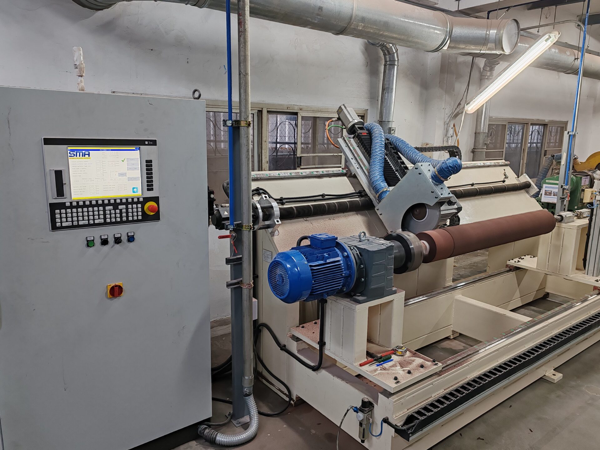 Cutting and grinding machine for NW rollers. This unit is equipped with diamond blades whose diameter is 350mm and thickness is 3mm. Very simple to use, versatile; maximum size for rollers is diameter 460mm and length is 1500mm. A suction system is needed for abrasive dust.
