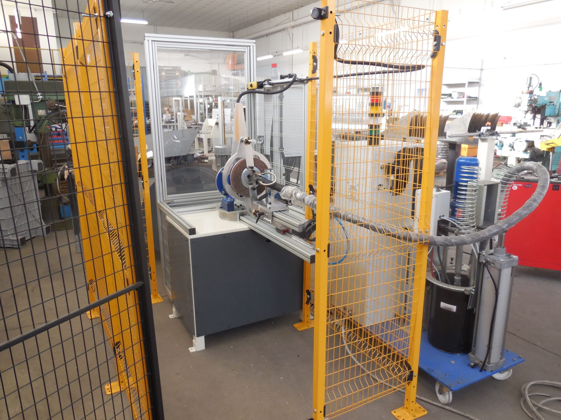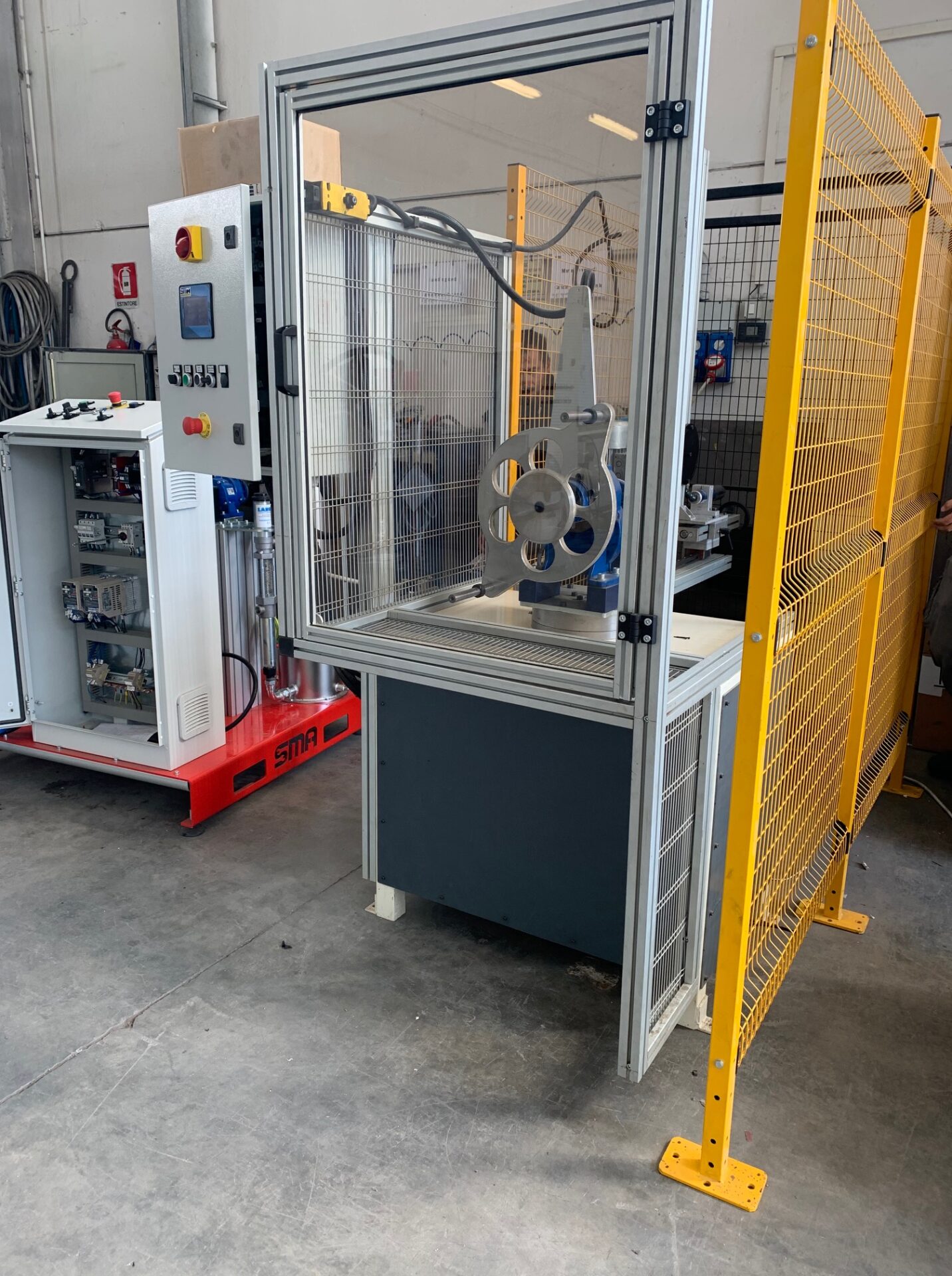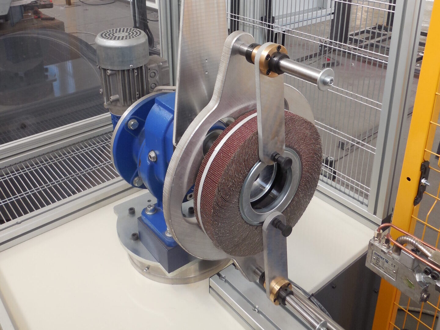Single station dosing and dispensing unit for unmounted flap wheels. Adhesive product is cast while the flap wheel is rotating. Maximum tolerable diameter is 400mm; a 4” operator panel includes settings for different working recipes.