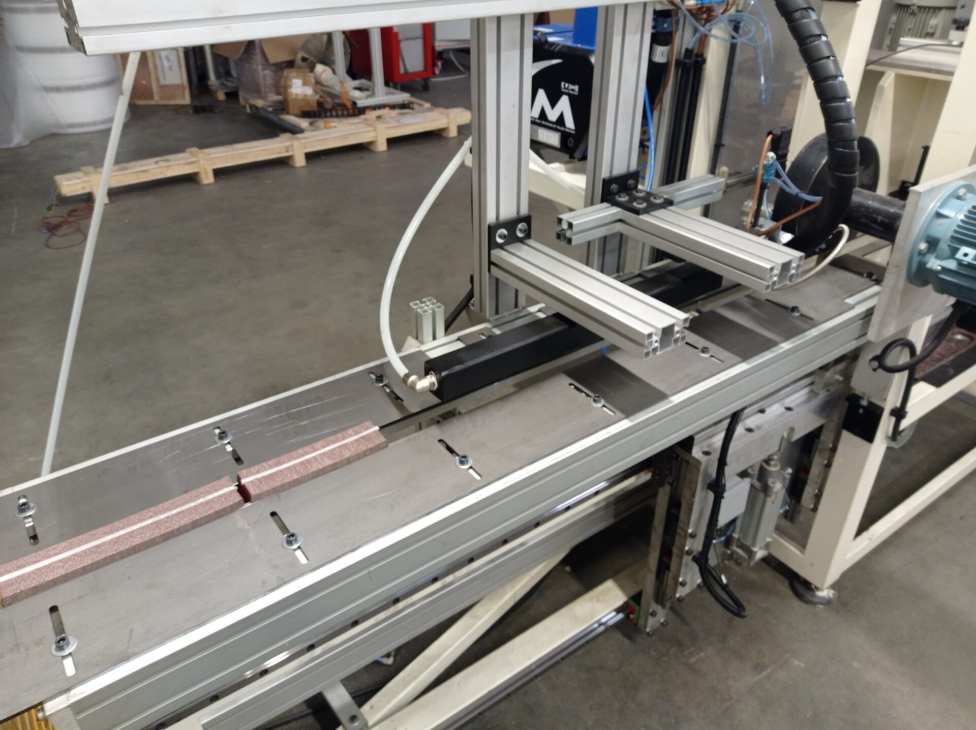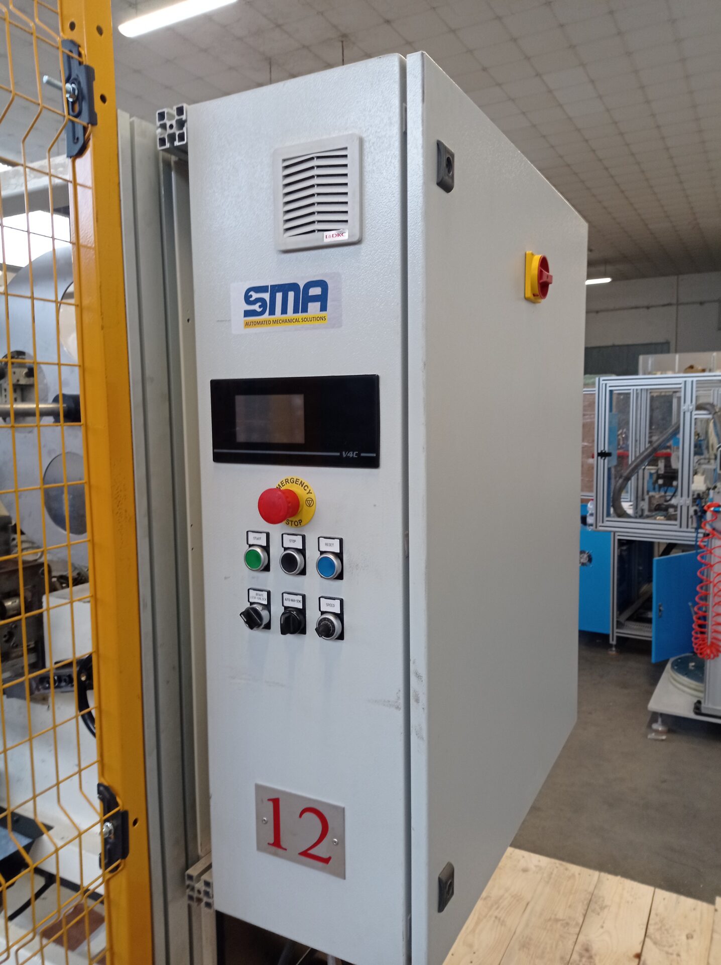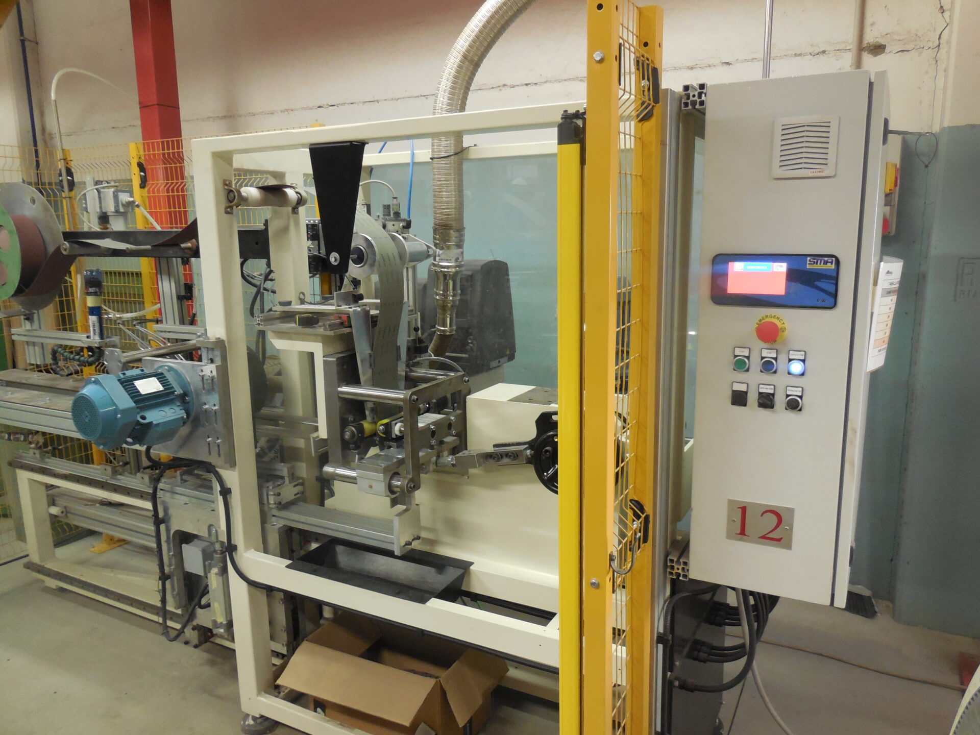 This machine manufactures abrasive cloth wheels with flange, ranging from 100mm to 350mm diameters, and up to a 100mm width. After flap cutting, a flap pack is formed and then stored in a unit at the end of the process. It is equipped with a multifunction touch screen panel that can set and store working recipes.