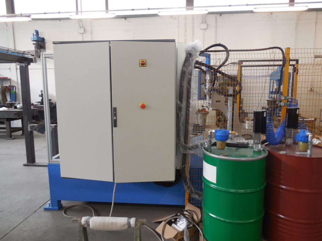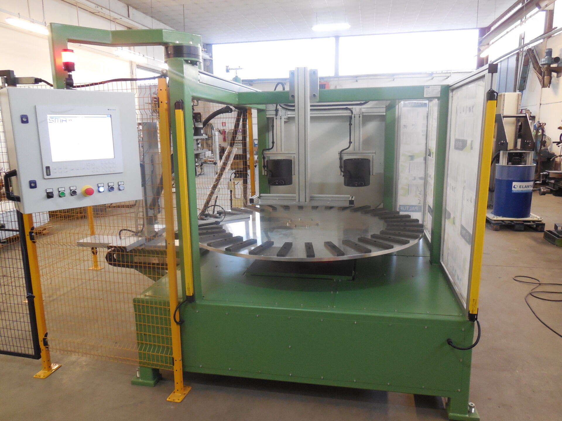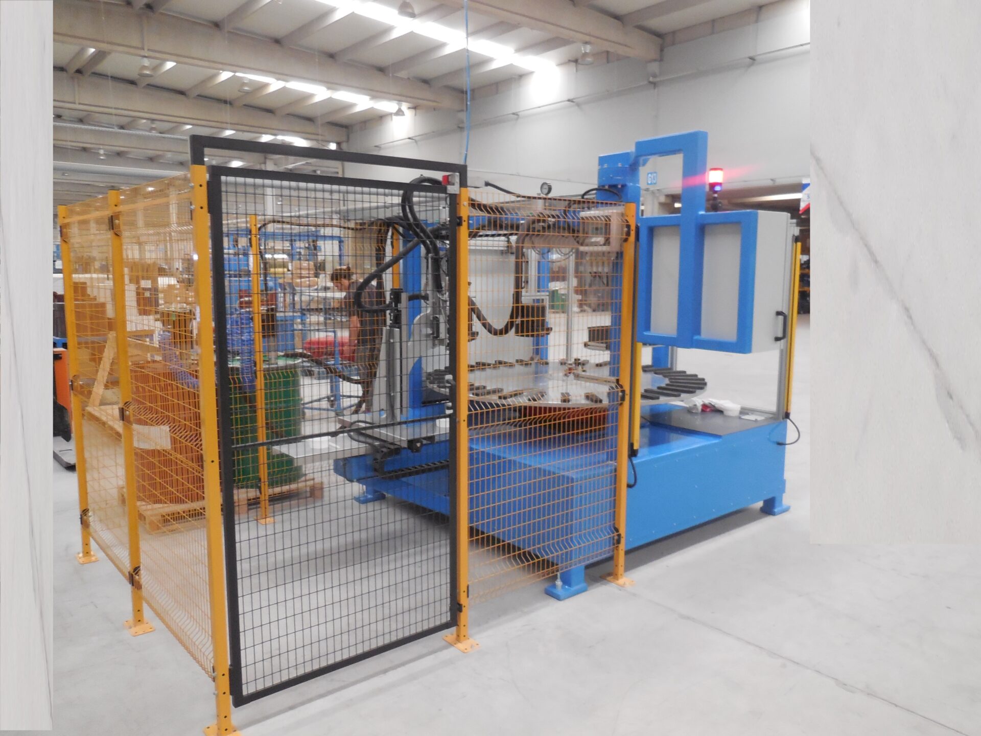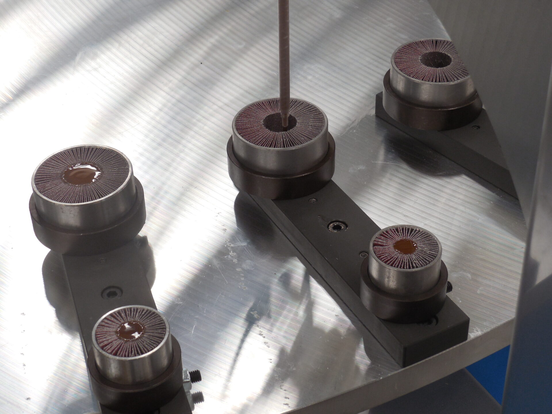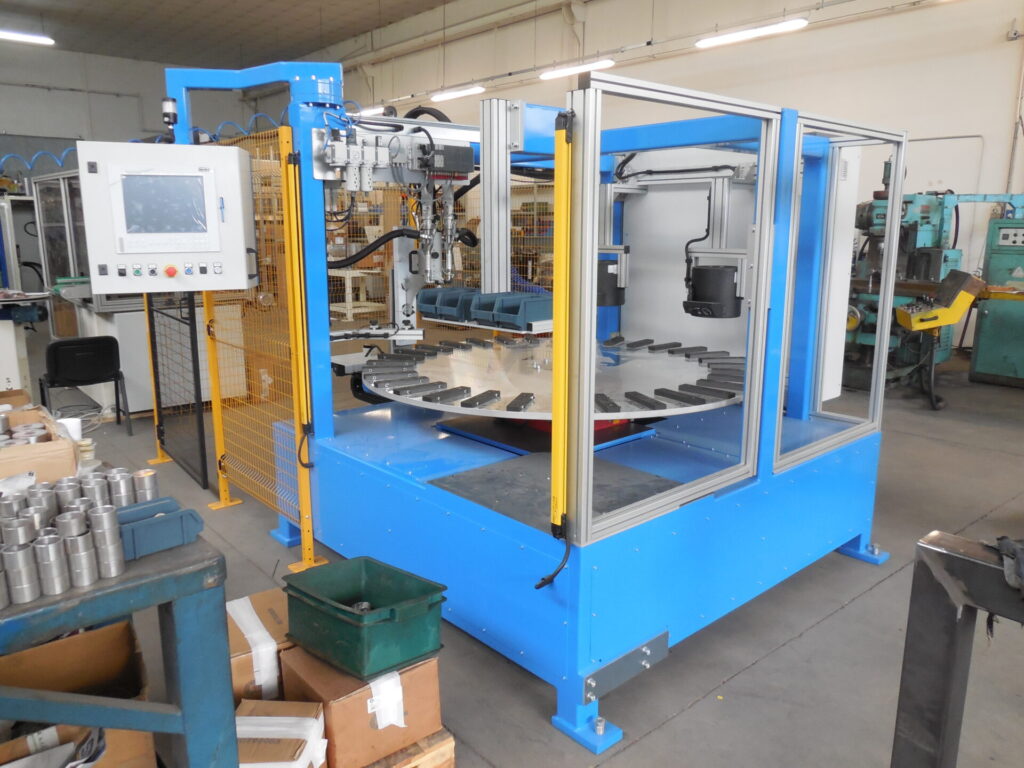 32-position dosing station, configurable in double or triple row layout, designed for high-volume production of cloth flap wheels with shank.