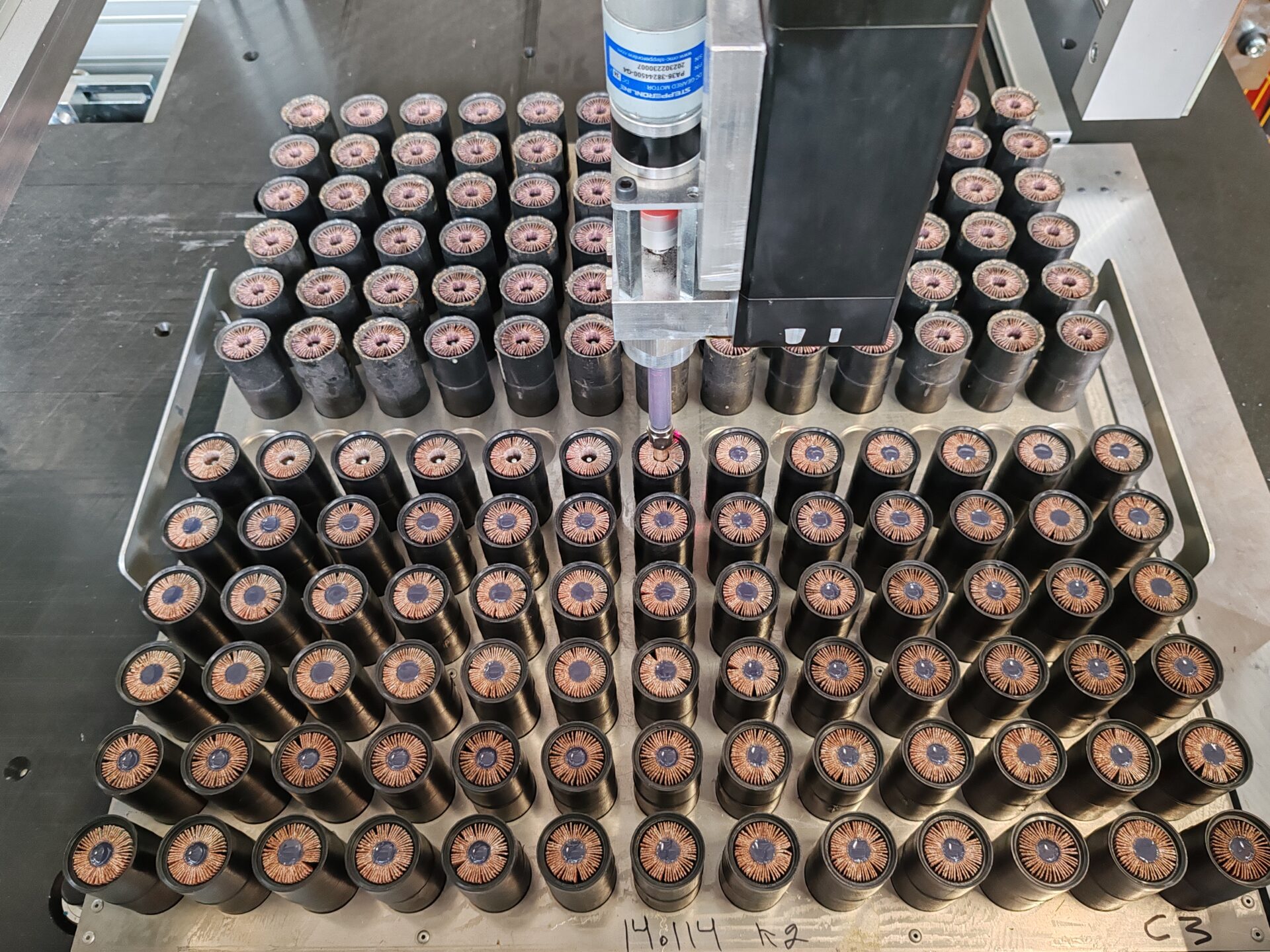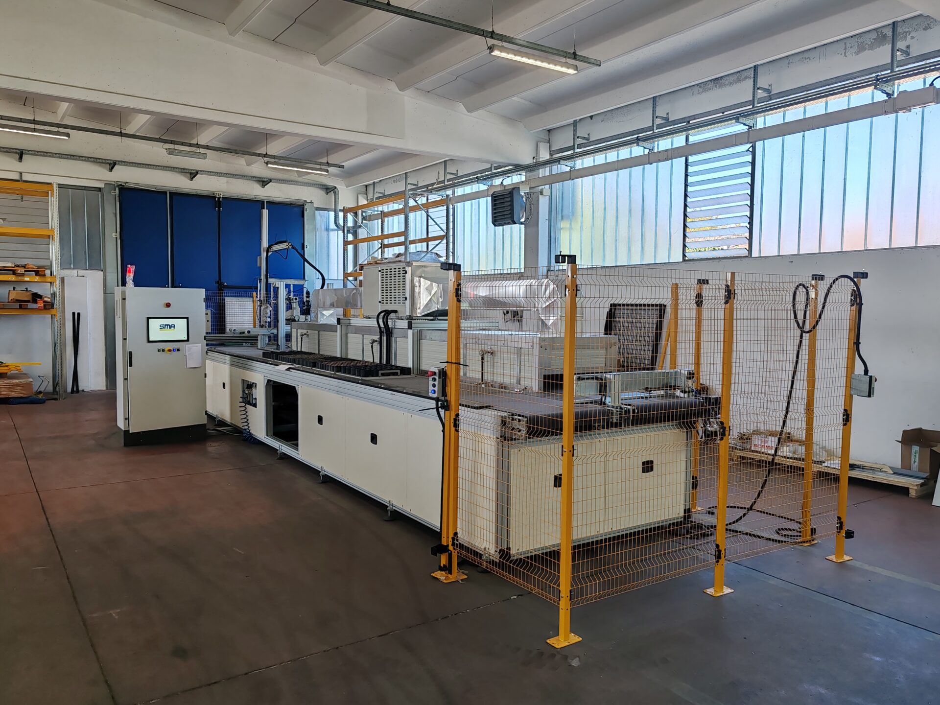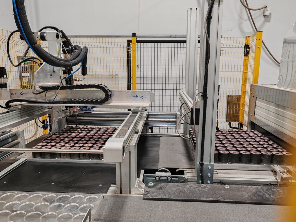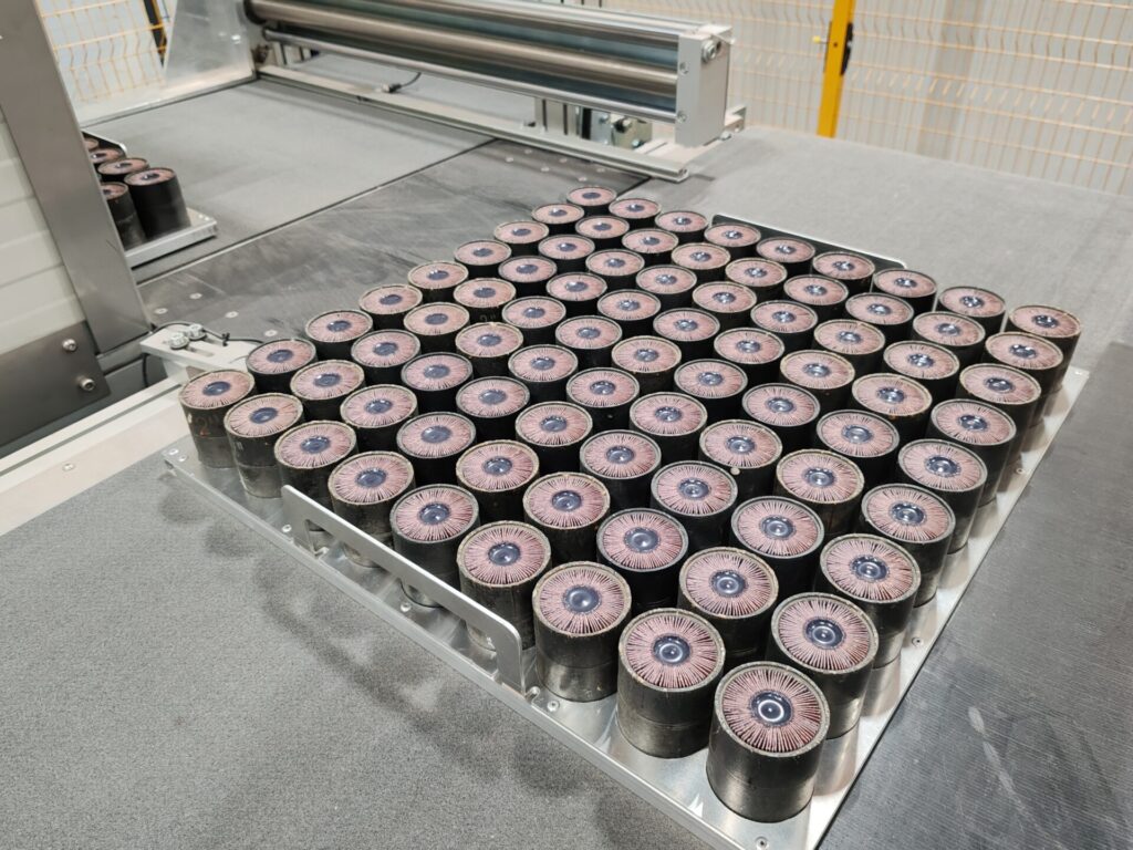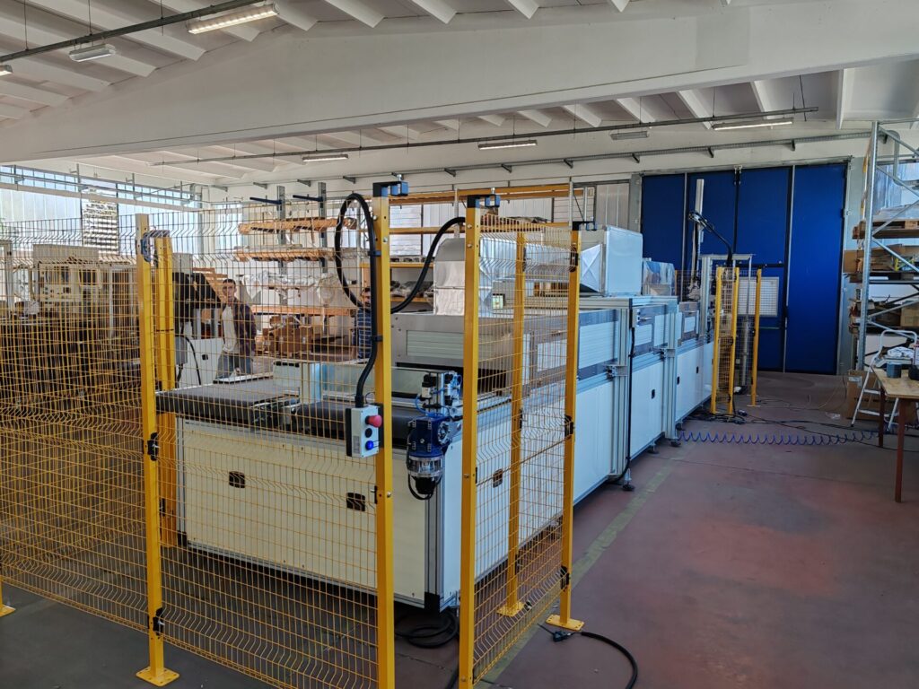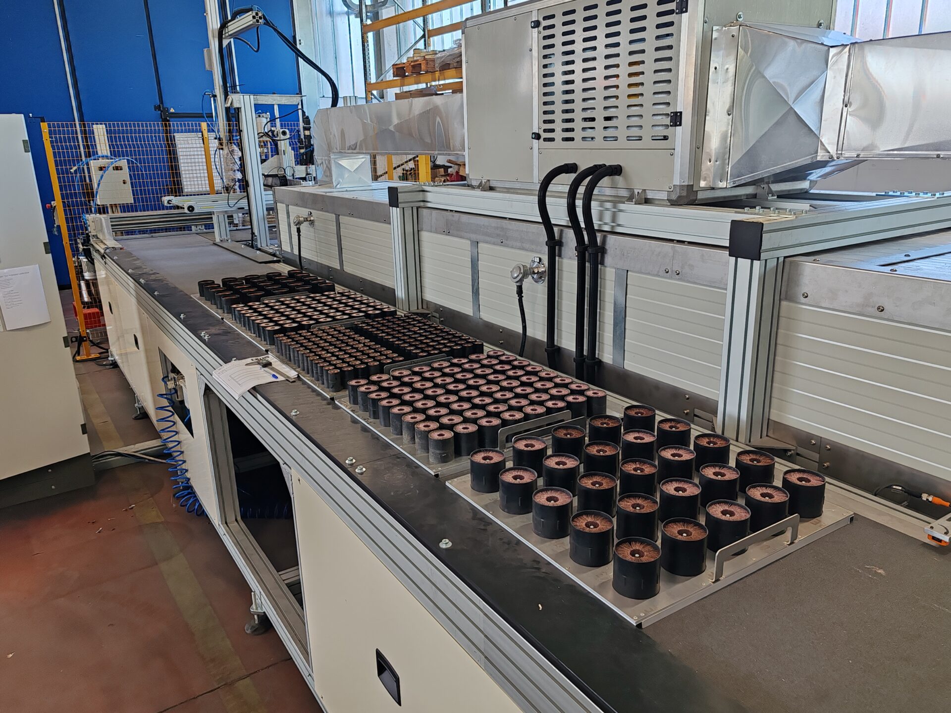 The use of the CUDM line consists of dosing two components and dispensing the mixture into the cavities of flap wheels with shaft. The wheels may have different diameters, widths, and abrasive grits. The trays, consisting of a mold containing a pack of flaps and a metal shaft, are loaded by the operator into the loading area and, via a conveyor belt, move toward the Cartesian robot. Once the trays reach the stop position, they are transferred into the Cartesian area by means of a pneumatic handling unit, where they are centered through a series of pneumatic movements. Subsequently, via the Cartesian robot, the products contained in the trays are filled with a mixture of hardener and resin. This mixture is previously prepared in the mixer, which receives the materials through a pneumatic self-priming immersion pump (hardener) and a follower plate pump (resin). Once the desired filling level of the products is reached, the trays are positioned on the conveyor belt by a second pneumatic handling unit, where the products are preheated by an infrared lamp. The products then move into the curing oven, where the core curing process takes place. Finally, once the trays exit the oven, they are placed on the exit conveyor belt by the last pneumatic handling unit, which carries them to the pick-up position where they are collected by the operator.