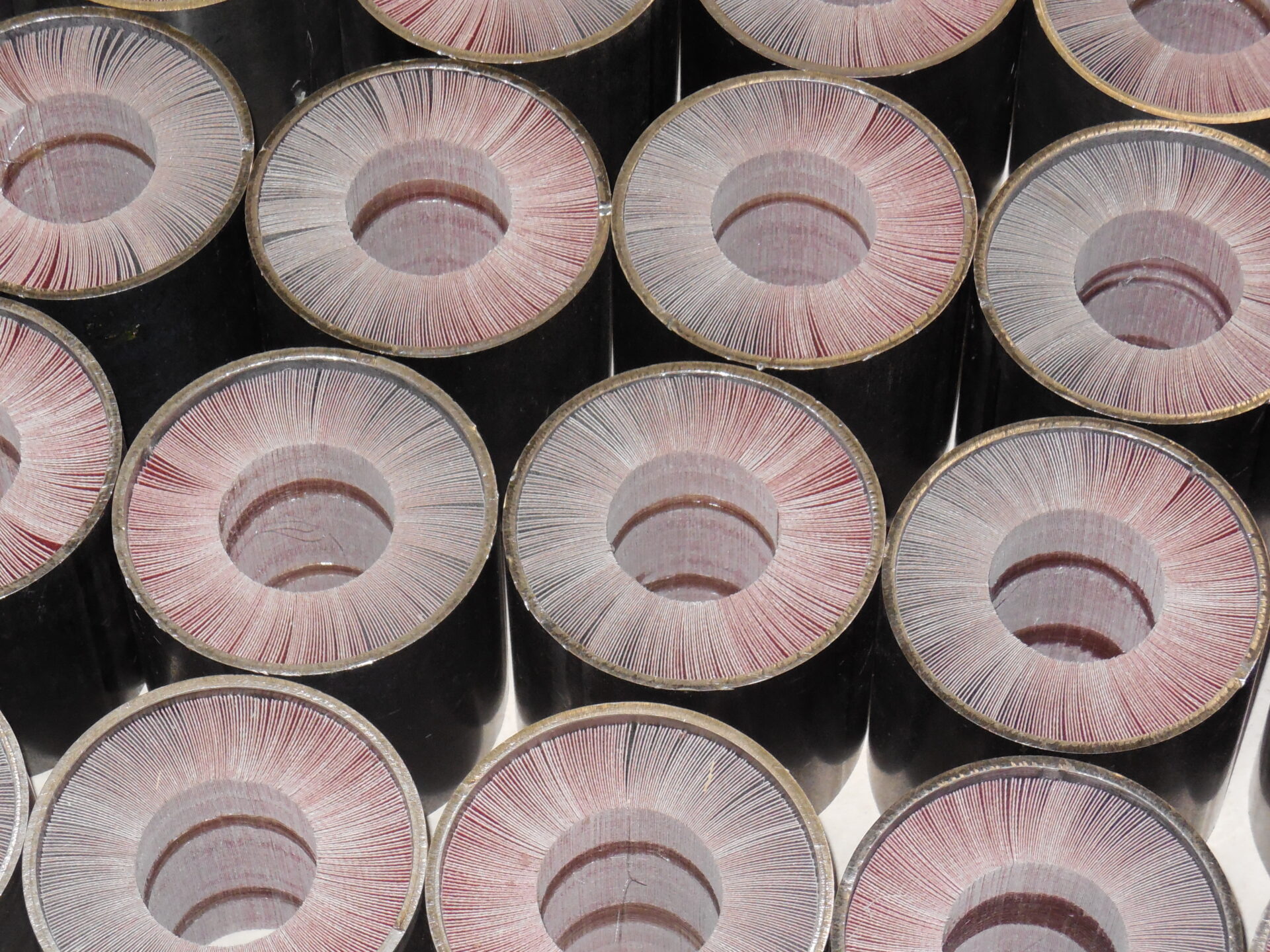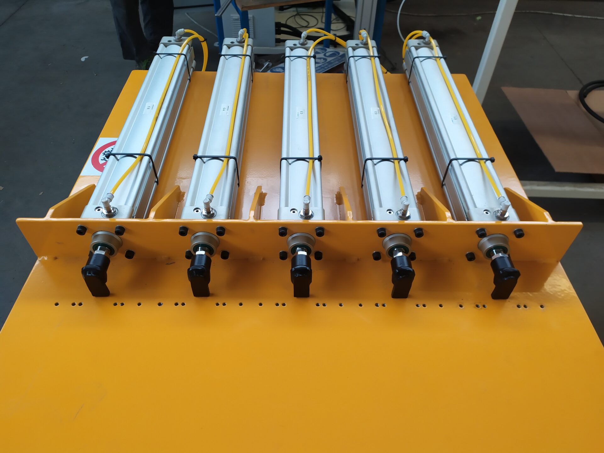 Mobile workbench for the forming of abrasive cloth wheels, in 100×100 and 100x50mm sizes. This system is equipped with a 5-workstation pneumatic press, whose maximum capacity is 200 kg per wheel. It features a Hot Melt dispenser for the gluing of flaps.