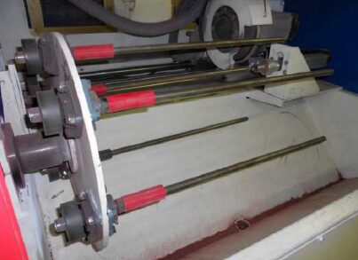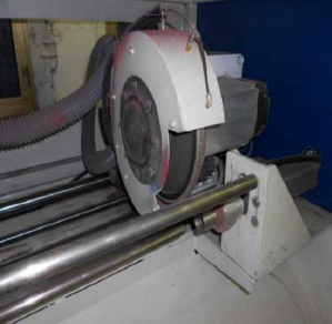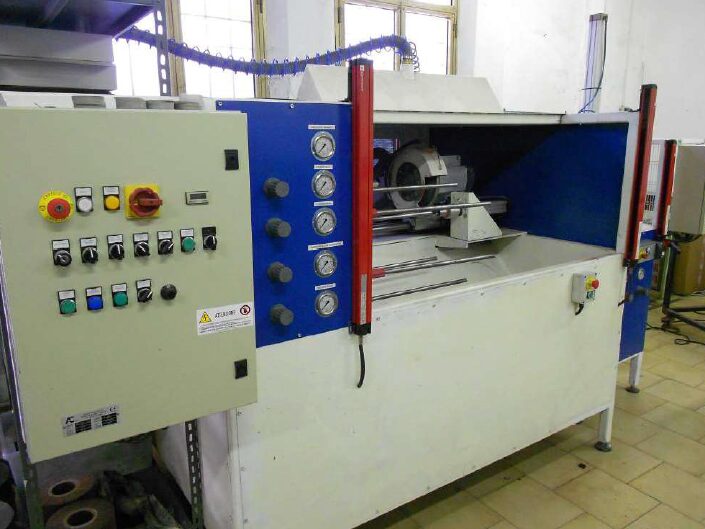 Automatic equipment for the granding of non-woven wheels. this automatic machine grinds non-woven wheels whose maximum diameter is 250mm and maximum length is 700mm (wheels are in a side by side configuration). Grinding is performed be means of a diamond blade whose diameter is 300mm and width is 20mm; it is specifically shaped to perform the grinding activity. Wheels are placed on a revolver that guarantees complete automation of the process; the operator has to unload and relead the revolver. With full load, the revolver can handle approximately 65 (250x50nn) wheels. tha machine is controlled by a PLC for the management of each work stage.