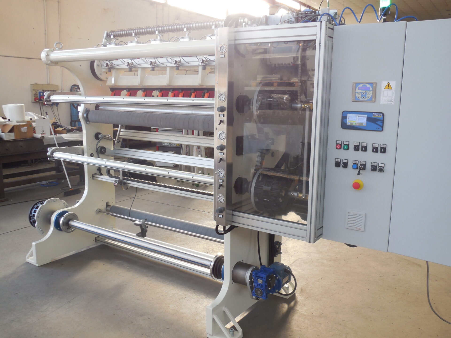 Machine for the slitting and rewinding of abrasive cloth and paper rolls. The purpose of this new generation machine is to provide the operator with full real-time control over the working procedure; the material is unwound and then rewound on the same side of the machine in order for the operator to be able to identify any defects on both sides of the product. The machine can be equipped with multiple accessories.