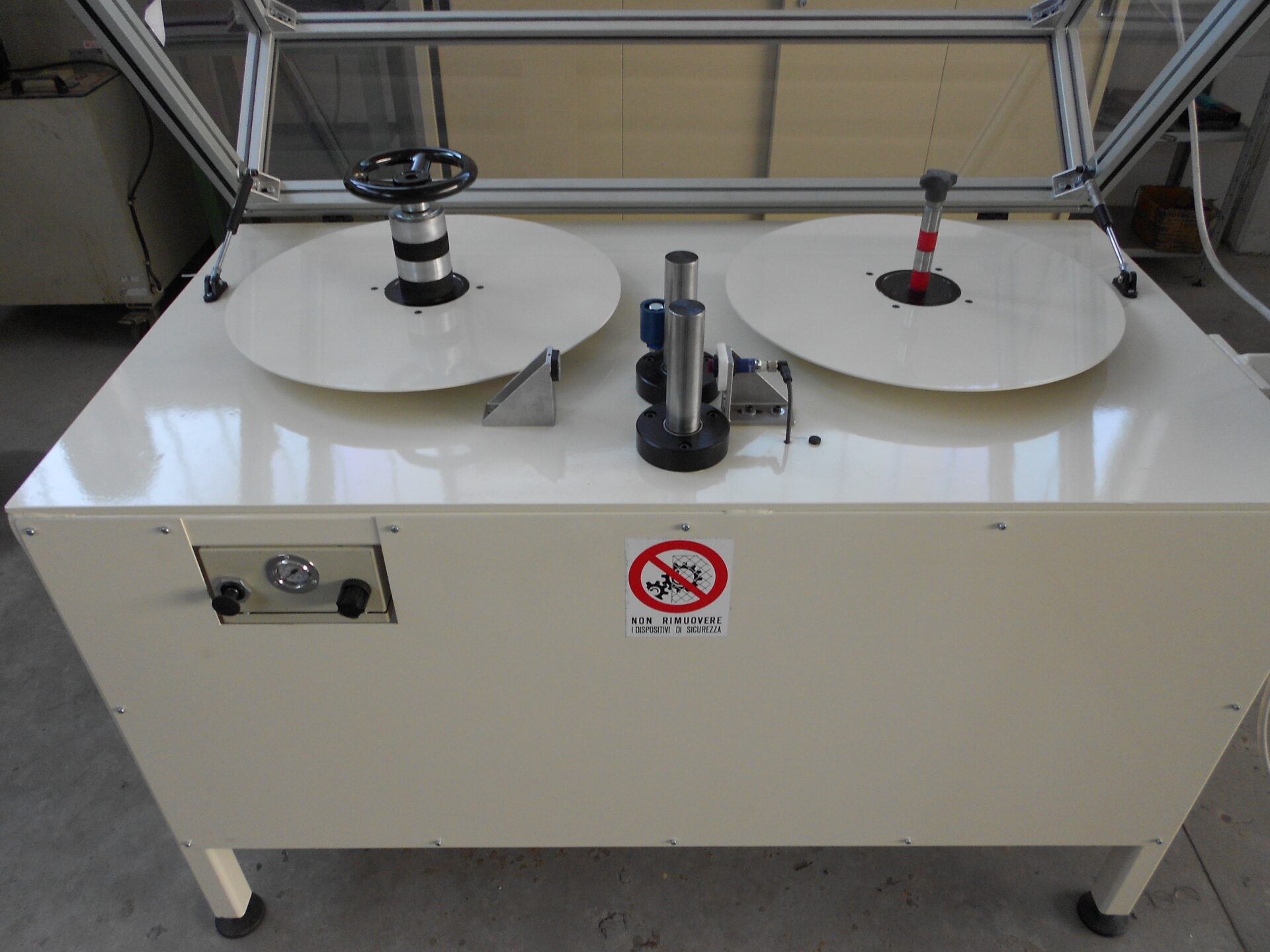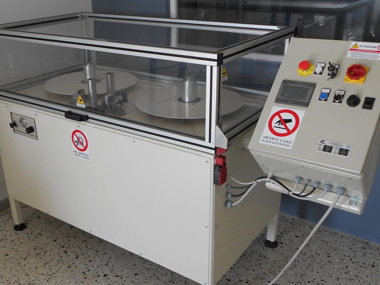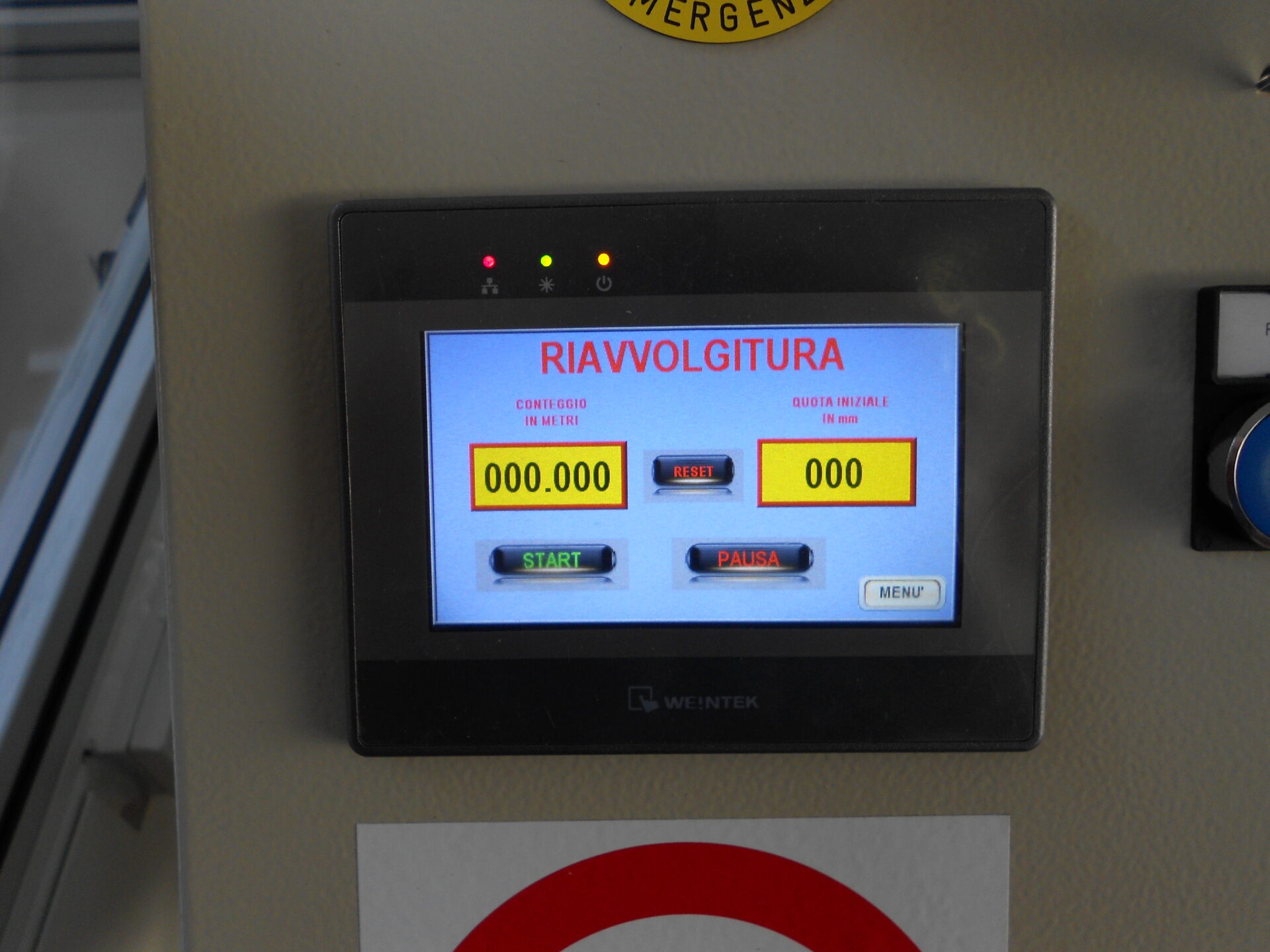 A rewinder and meter counter for rolls. The machine has an unwinder with automatic brake and a winder with a 2kW gearmotor and up to 50m/min rewinding speed. An encoder is mounted on an idler shaft for meter counting.