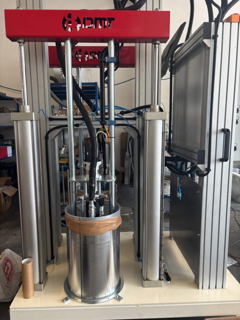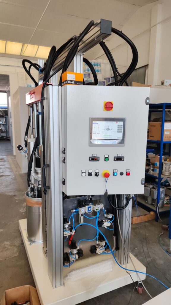Dispensing unit for semi-solid, highly thixotropic, or filled adhesives. This unit is equipped to provide very accurate dispensing of structural adhesives for composite materials and industrial assembling. With this easy-to-use unit, the operator can change the mixing ratio and dosing speed in a simple and intuitive way. Electronic control and automatic monitoring on dosing pumps input and output working pressure. Drum extruders for 20kg-capacity containers. Triple-screw pumps for the accurate dosing of components A and B. Heated circuit, featuring a 25-to-80°C temperature control unit. Assisted dynamic mixing head.