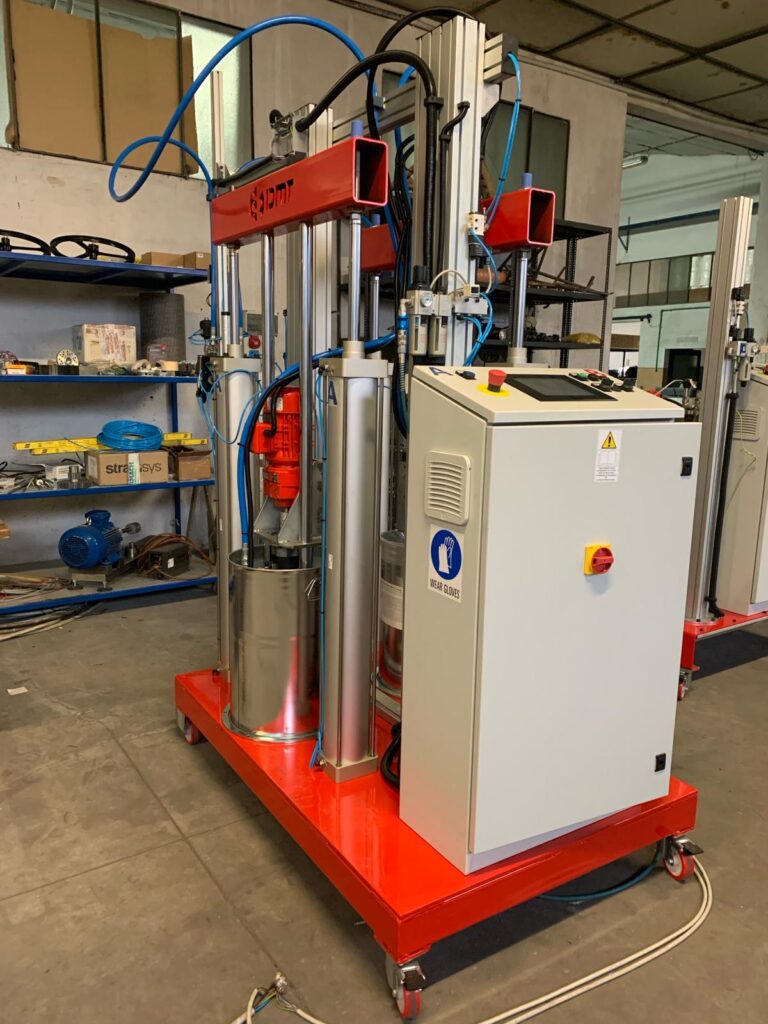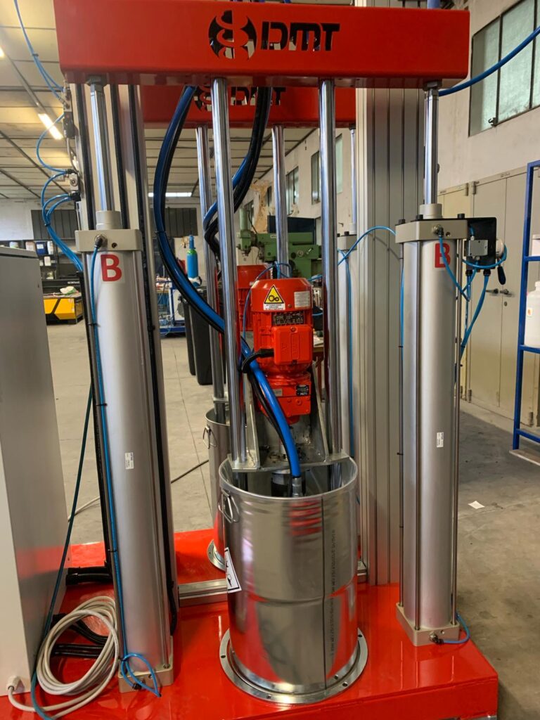 Dispensing unit for semi-solid, highly thixotropic, or filled adhesives. This unit is equipped to provide very accurate dispensing of structural adhesives for composite materials and industrial assembling. With this easy-to-use unit, the operator can change the mixing ratio and dosing speed in a simple and intuitive way. Electronic control and automatic monitoring on dosing pumps input and output working pressure. Drum extruders for 20kg-capacity containers. Triple-screw pumps for the accurate dosing of components A and B. Heated circuit, featuring a 25-to-80°C temperature control unit. Assisted dynamic mixing head.