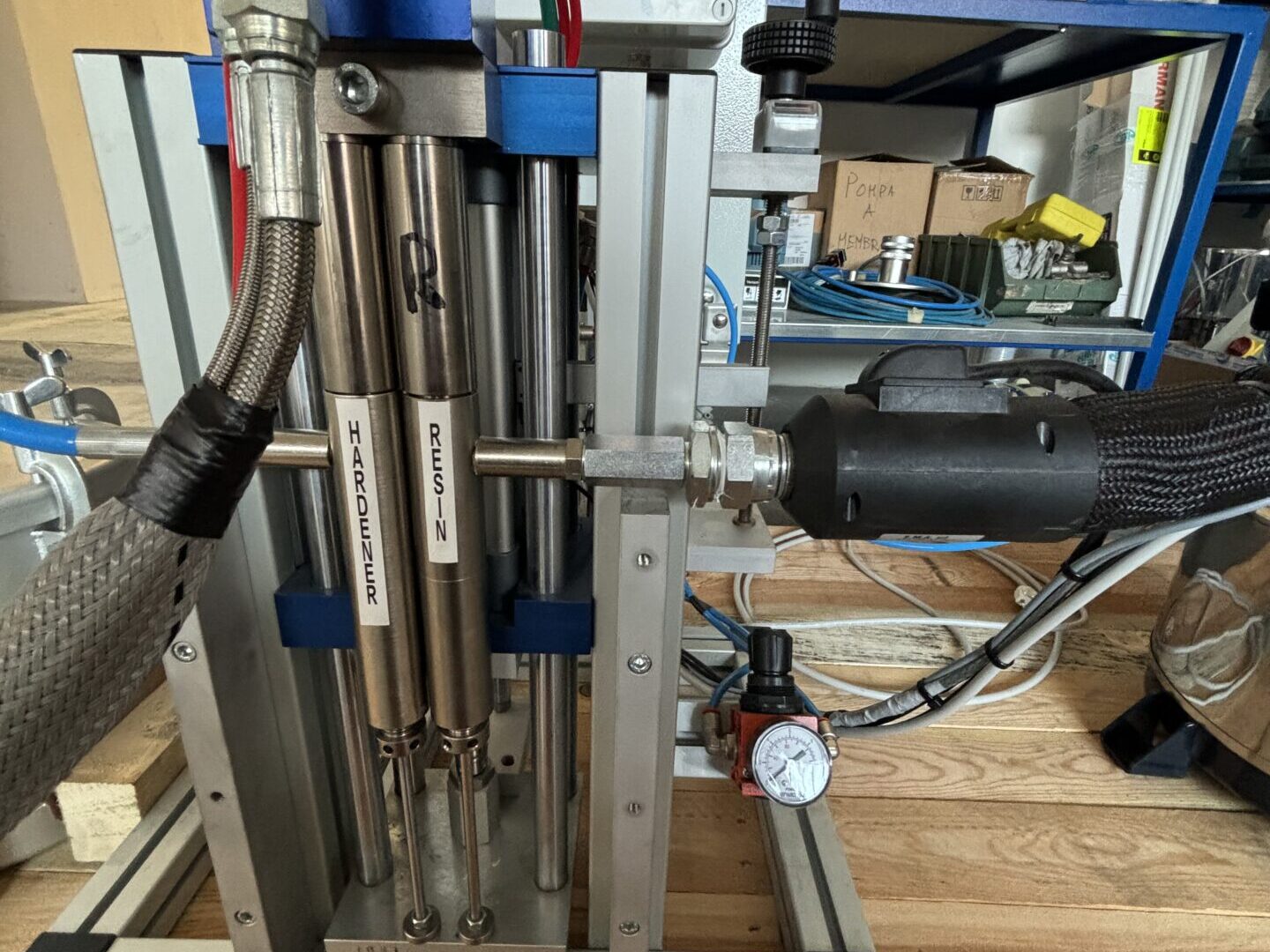 Via gun trigger, the system enables pneumatic cylinders, which are connected to single-acting displacement pumps. Products are then transferred to the mixing head as per predetermined fixed ratio.