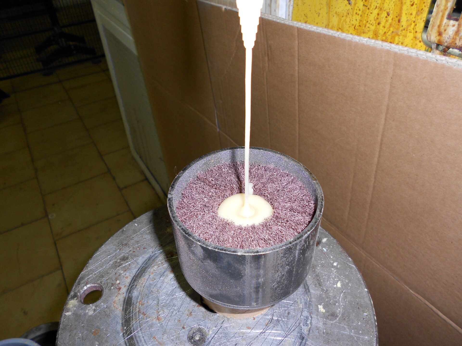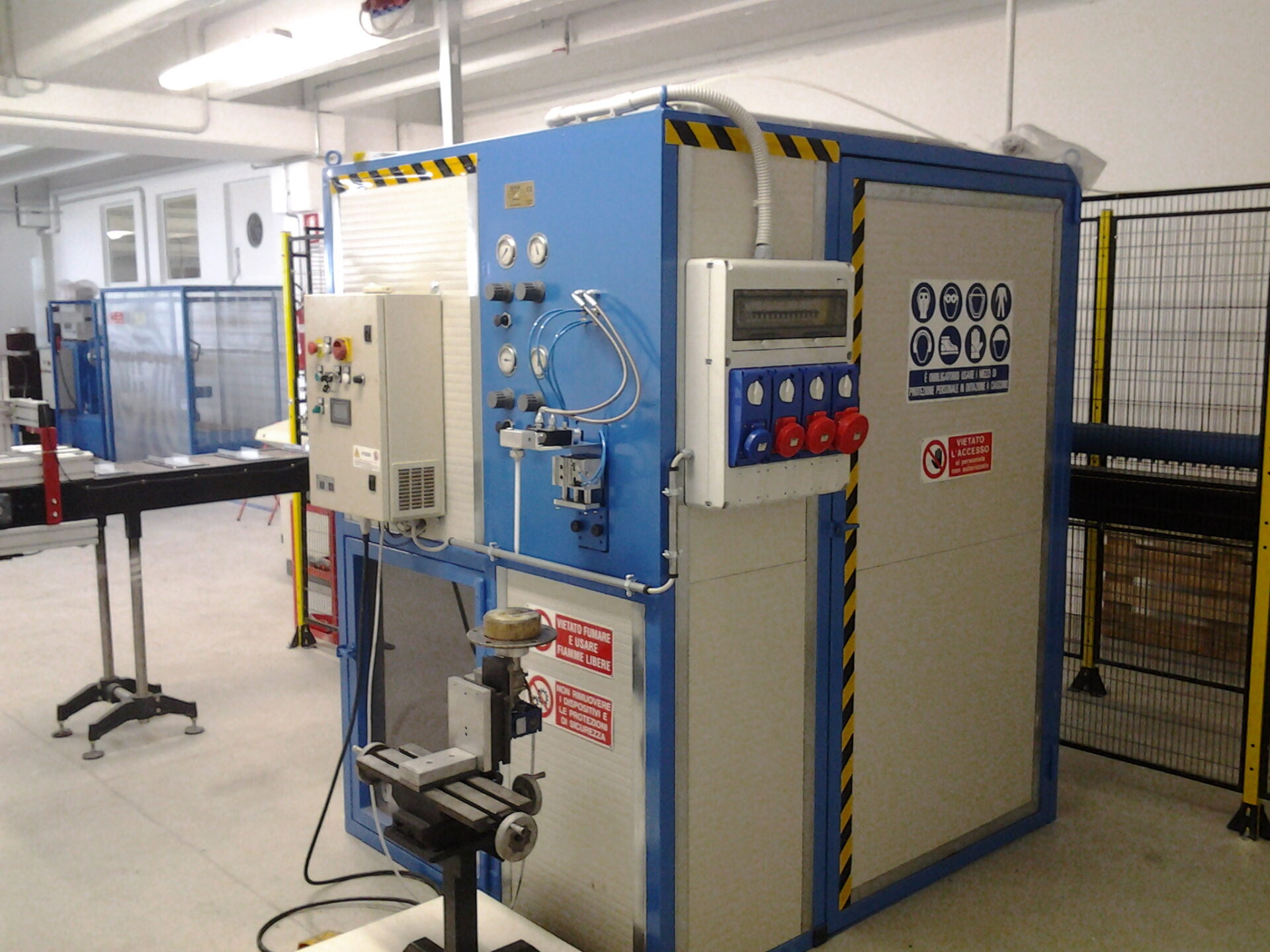 This is a dosing unit for two-component resins. It is a volume proportioning machine that uses piston pumps to dispense adhesive into abrasive wheels. 200/250kg drums of resin are stored in an insulated box; piston pumps extract the product and transfer it into flux regulators; finally, pumps dispense the product. The mixing unit is composed of a head block, made of AISI-3016 stainless steel, and a double on/off valve. This machine is controlled by an operator interface that manages the dosing parameters, the ratio between component A and component B and the dispensing mode of the product.