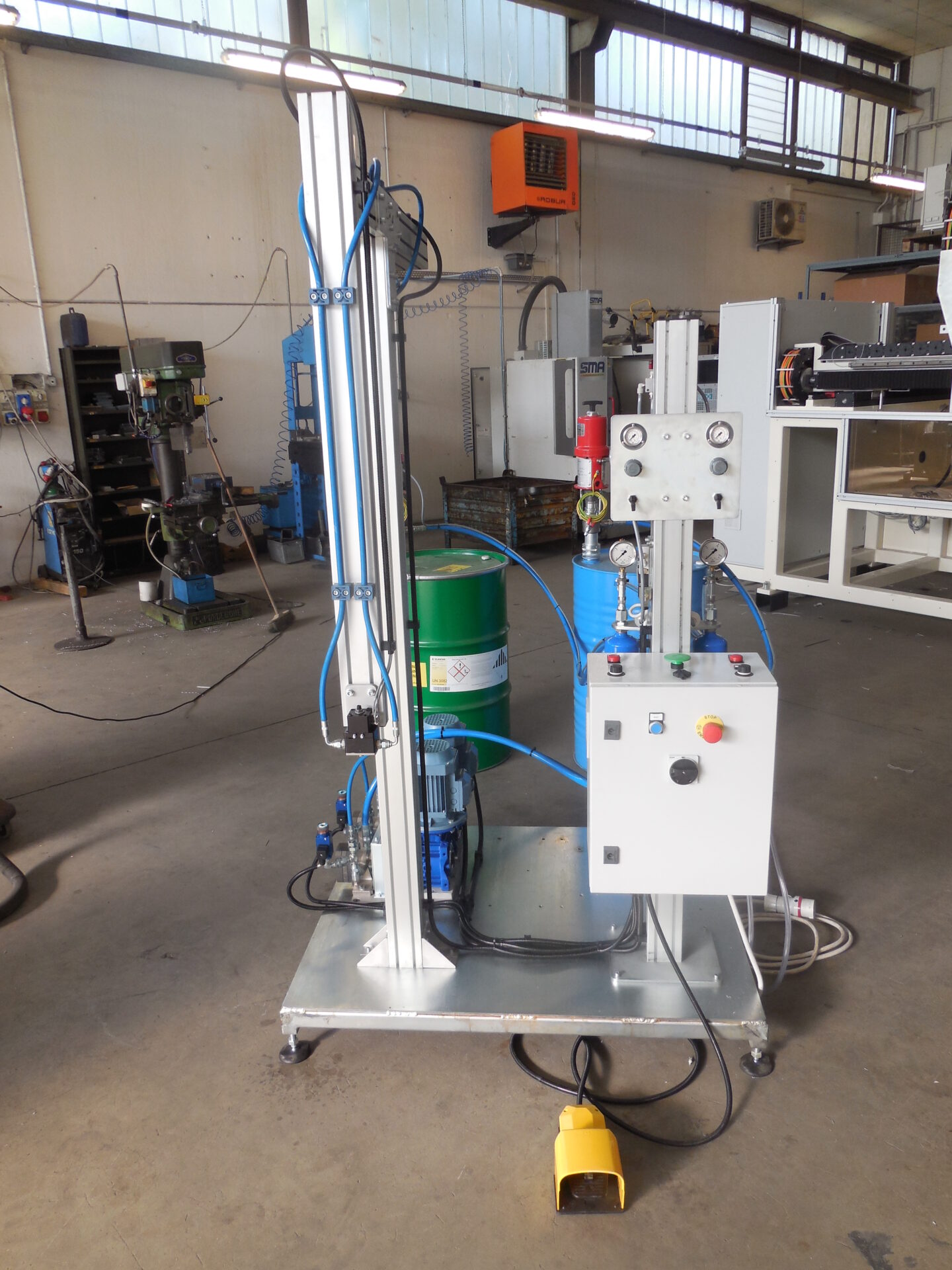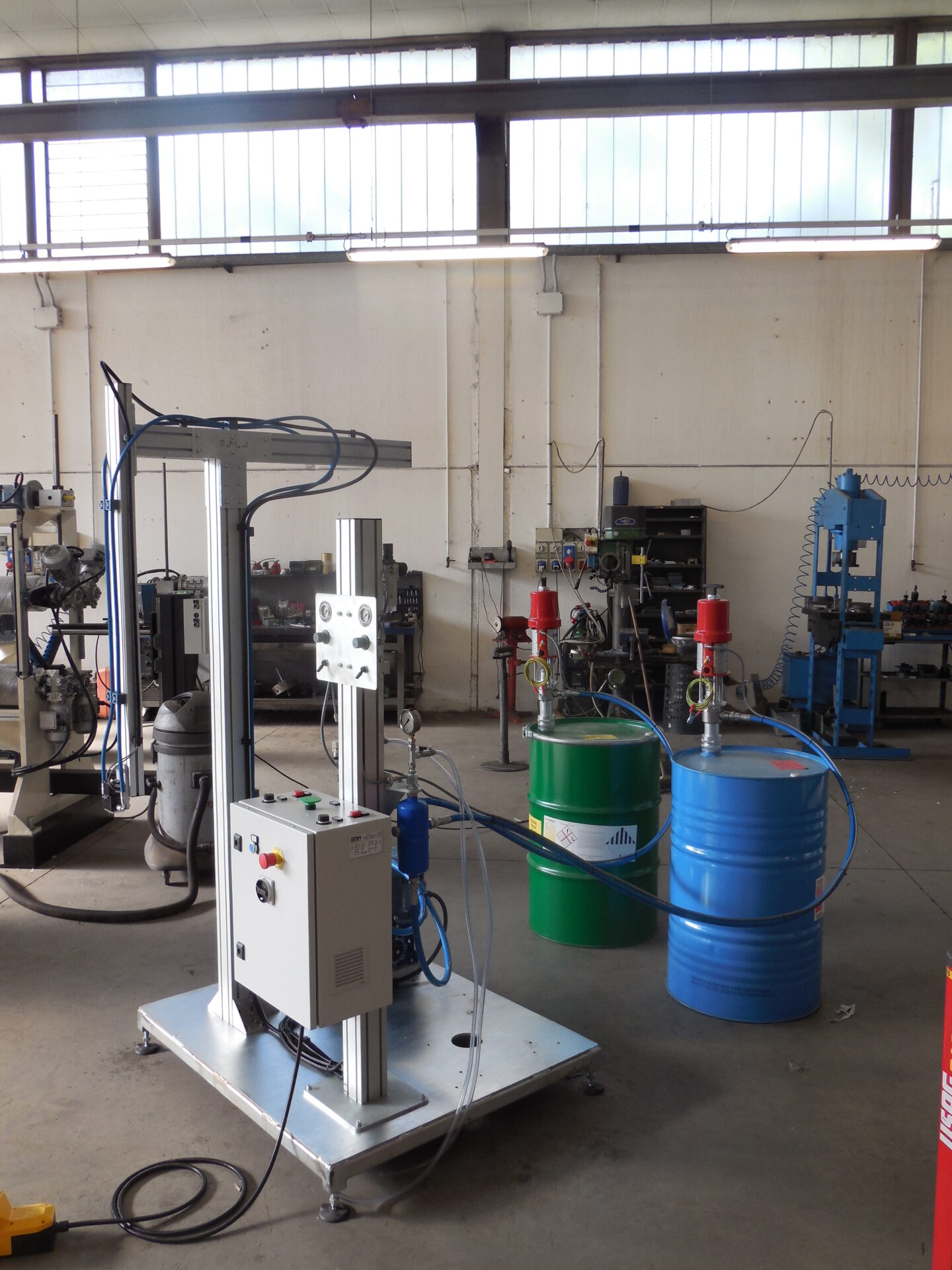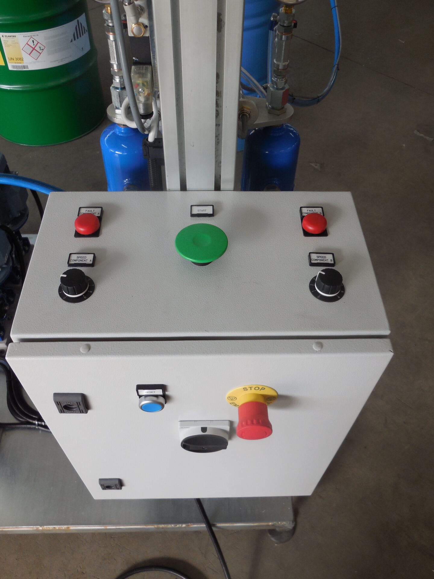 Dosing unit with gear pumps and transfer pumps for direct suction from drums or cans. It features a simplified operator panel, mixing ratio can be varied. The machine is suitable for dosing via pedal or via start button, and it is equipped with overpressure valves and a dosing valve with anti-drop device.