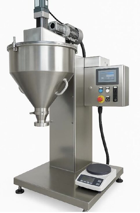 The operator places the container on the scale, beneath the screw feeder outlet.
