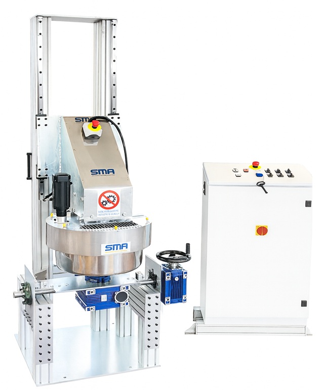 Mixing bowl made of AISI 304 stainless steel, with rounded bottoms and reinforced edges. Pneumatically lifting top cover equipped with a mechanical safety lock during maintenance or material loading. Bowl rotation by gear reducer and manual positioning handwheel. Supporting frame in welded steel with epoxy powder industrial coating.